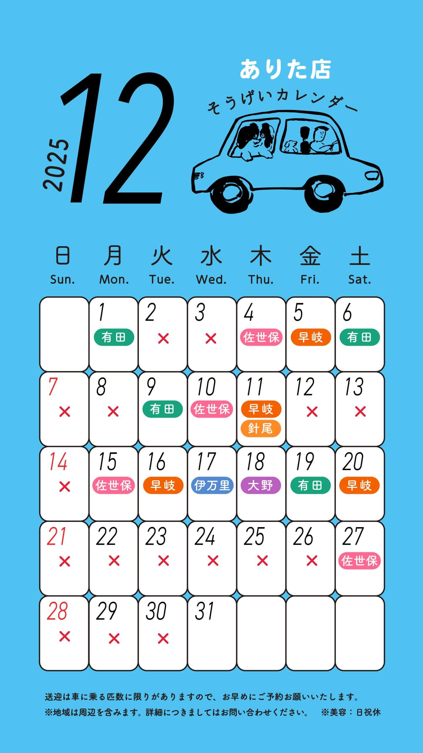 スルーラブありた店 送迎カレンダー