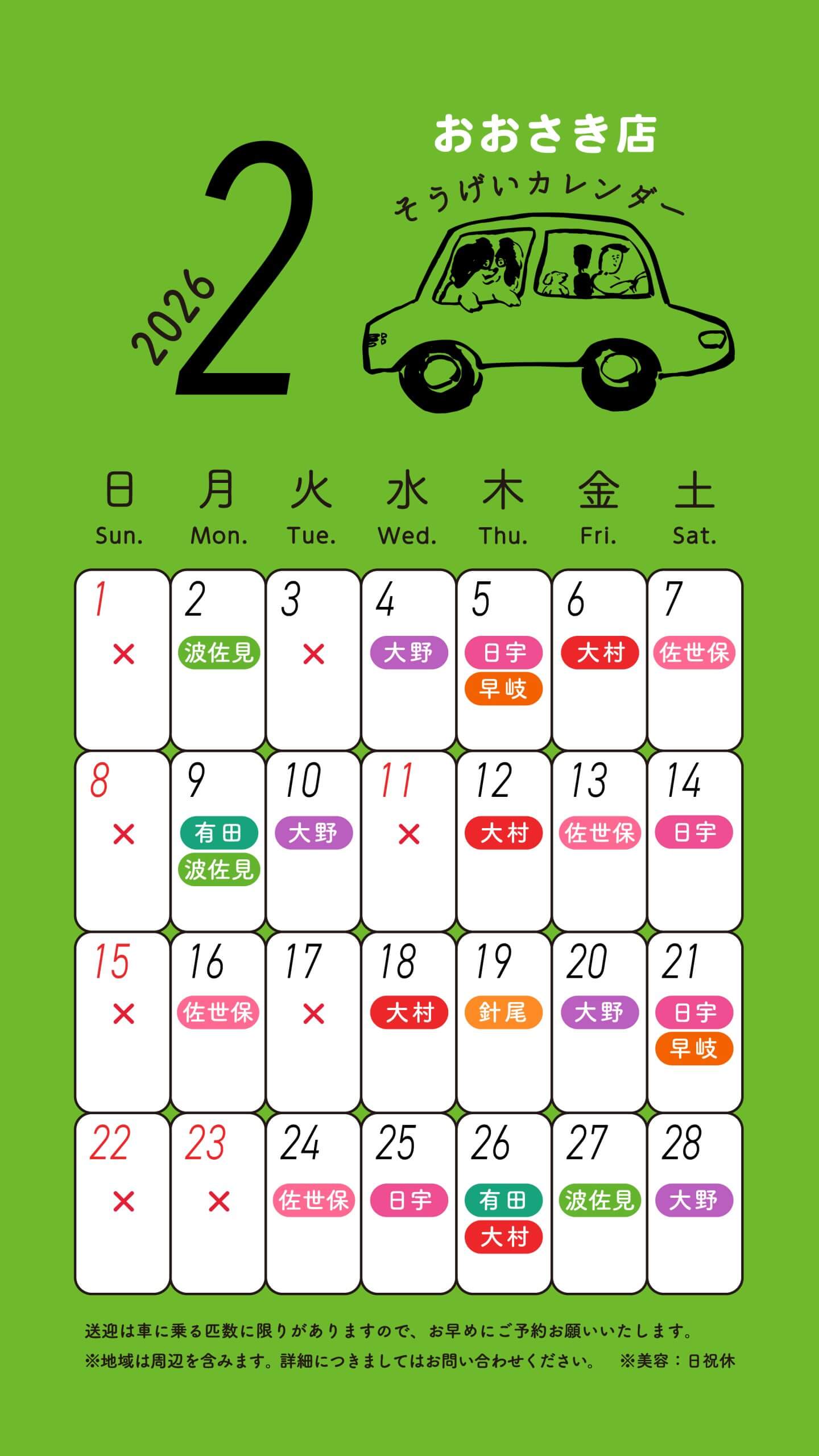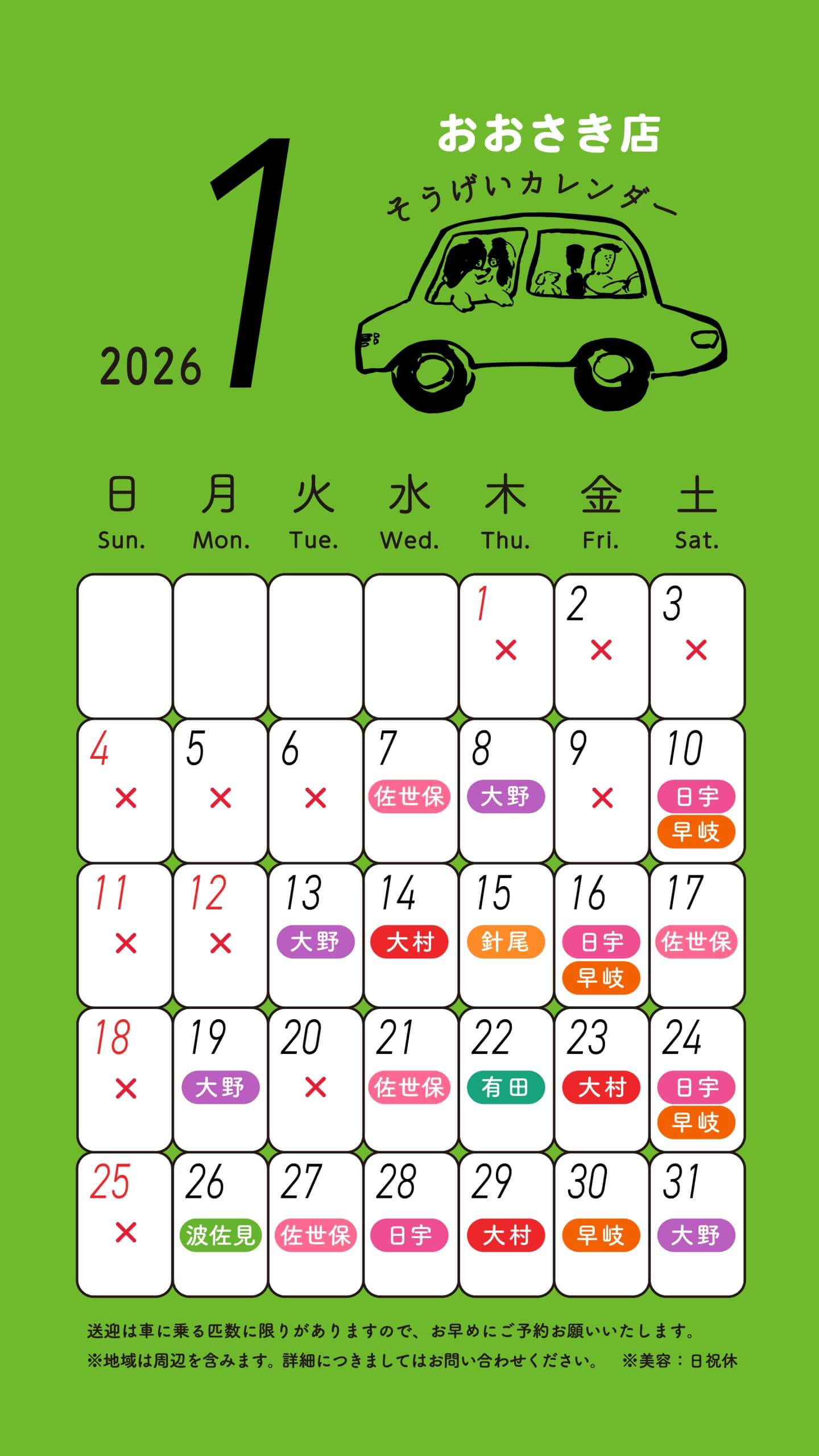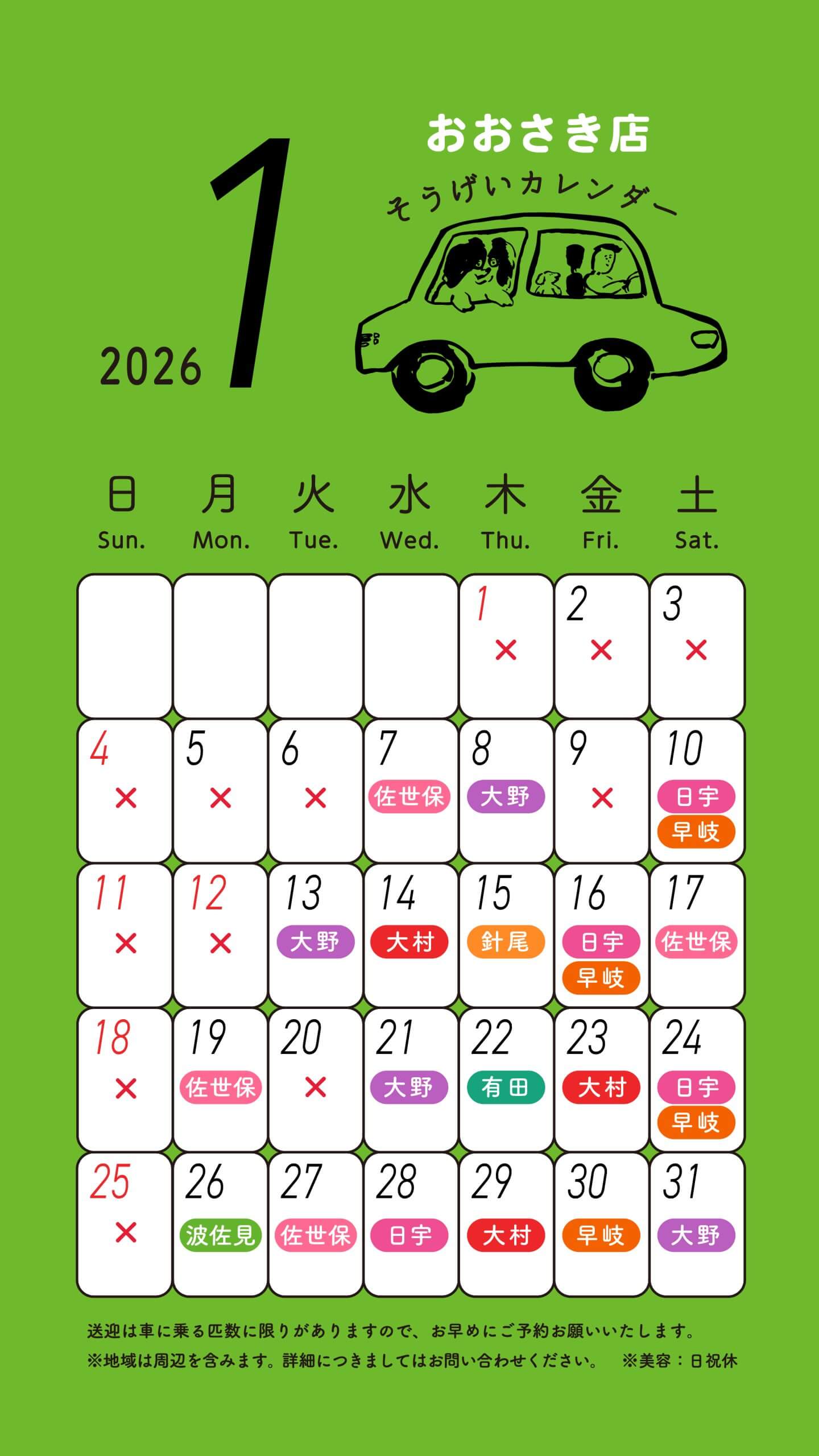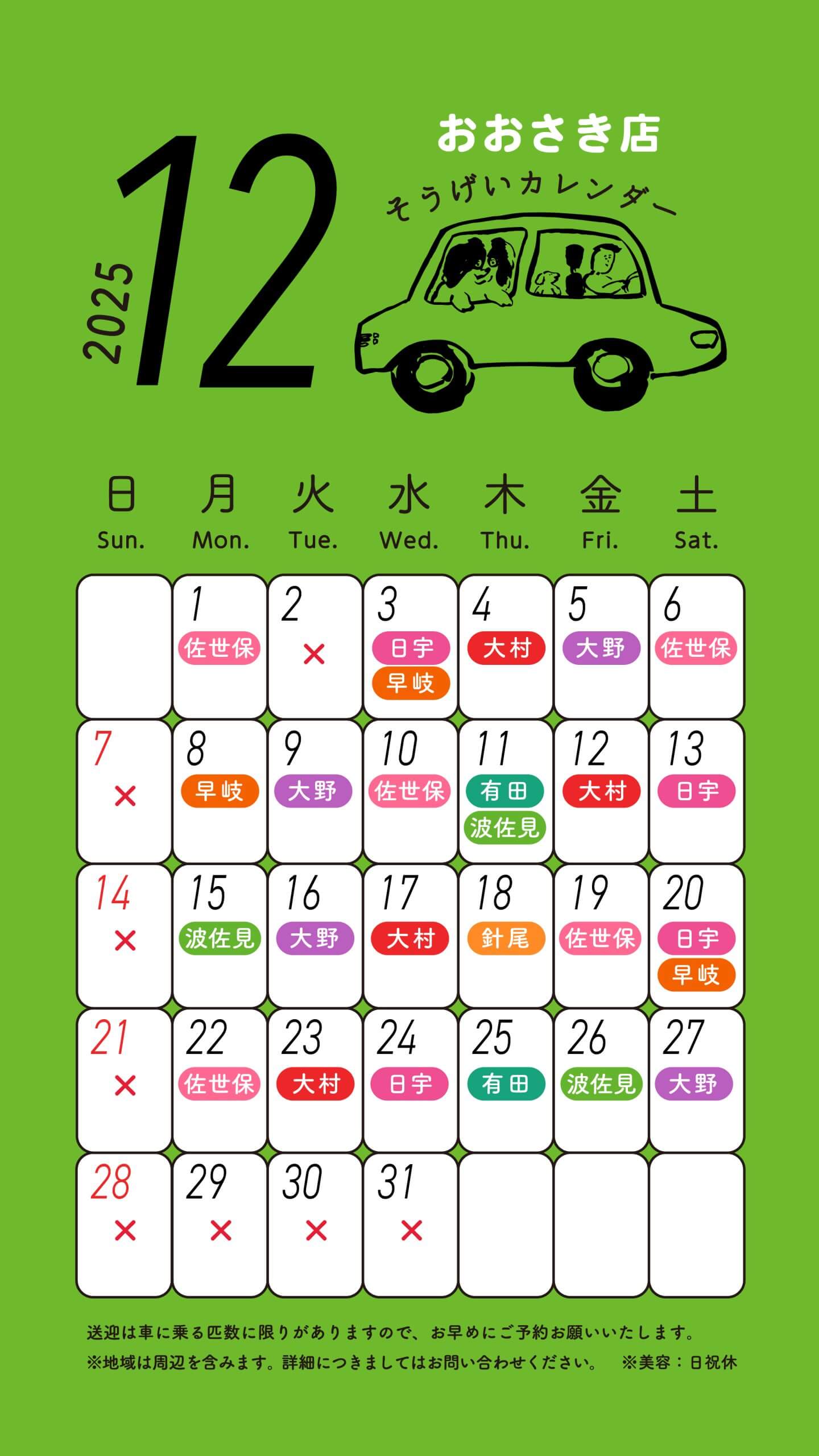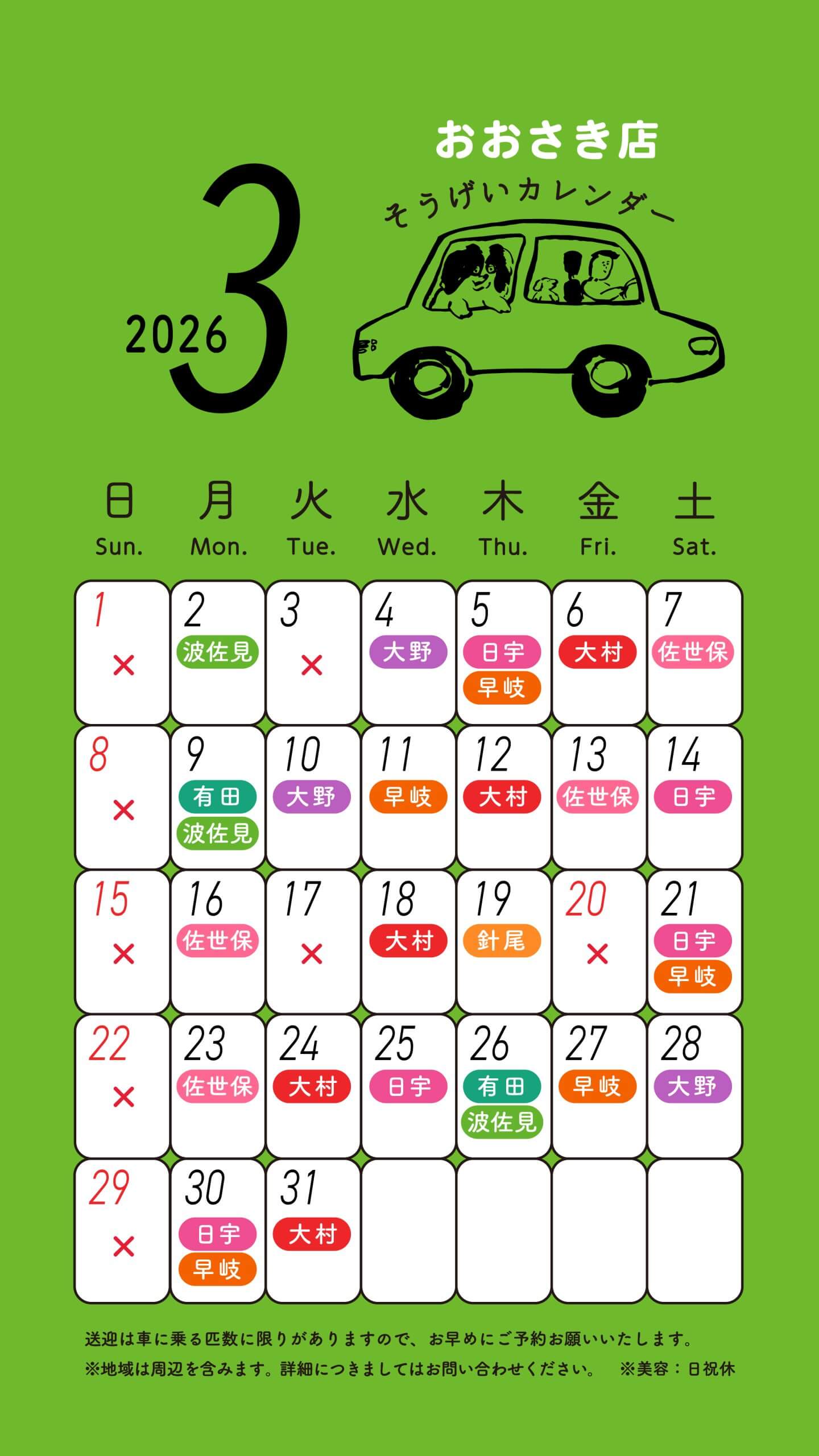 スルーラブおおさき店 送迎カレンダー 2021.6.17 お知らせ おおさき店 【送迎料金】 <送迎料金 (税込)/片道20kmまで> ・往復 1,100円 ・片道 660円 ※有田町内の方のみ 往復550円・片道330円 ※片道20km圏外の方もお気軽にご相談ください。 【送迎料金 無料特典あり】 送迎ご利用当日に店内商品3,300円(税込)以上ご購入で、送迎料金無料サービスを行っています。ペットシーツ、ドッグフード、犬具、おやつなどを販売しております。 ※片道20km以上の送迎料金はかかります。 一覧に戻る